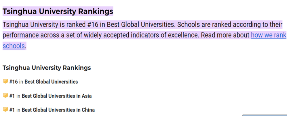 “Tsinghua” Universiteti “Ən Yaxşı Qlobal” Universitetlər sıralamasında 2024 -cü ildə “THE” reytinində 12-ci yerdə, 2025-ci ildə isə “US News-Best Global Universities” reytinqində 16-cı yerdə qərarlaşıb.