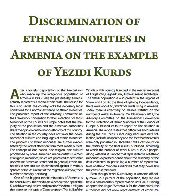 Ümumiyyətlə, Ermənistanda etnik azlıqlar həyatın müxtəlif sahələrində ayrı-seçkiliyə məruz qalır. Miqrasiya axını nəticəsində onların sayı durmadan azalır. Ermənistanın ən böyük etnik azlıqlarından biri olan yezidi kürdlərin belə hakimiyyət institutlarına və parlamentə daxil olmasına sədd çəkib. mənbə
