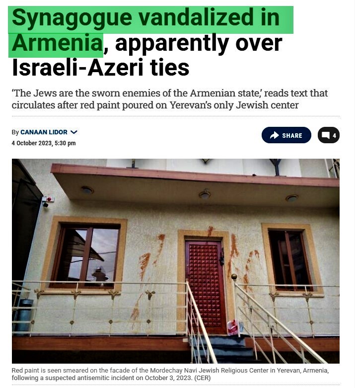 Ermənistanda yaşayan azsaylı yəhudilərin daim hədələnməsi, İrəvandakı Yəhudi Mədəniyyət Mərkəzinin vandalizm aktına məruz qalması, 2023-ci ilin oktyabr ayında şəhərdəki yeganə sinaqoqun “Molotov” kokteyli ilə yandırılması, sinaqoqun divarlarının təhqiredici ifadələrlə boyadılması bu ölkədə başqa xalqlara qarşı etnik-dini nifrəti açıq nümayiş etdirir. timesofisrael
