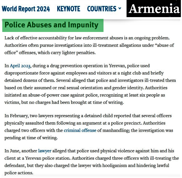 Polisin öz vəzifəsindən sui-istifadə edərək vətəndaşlara qarşı amansız davranışı və bunun müqabilində cəzasızlığı, eləcə də güc orqanlarının inzibati imkanlarından istifadə edərək insanların hüquqlarını davamlı olaraq pozması Ermənistanda ictimai mühitin gərginliyindən xəbər verir. Polis “narkotik maddə axtarışı” adı altında xidmət və iaşə sektorunda çalışan sahibkarları incidir, işçilərə və qonaqlara qarşı güc tətbiq edir. İfadə və məlumat azadlığının pozulması adi hala çevrilib, diffamasiya dekriminallaşdırılsa da, siyasətçilər və özəl bizneslər tez-tez jurnalistlərə və media orqanlarına qarşı mülki işlər qaldırır, onları uzun sürən məhkəmə çəkişmələrinə sürükləyir və ağır maliyyə cəzaları ilə hədələyir. Hakimiyyətin öz siyasi rəqiblərinə qarşı amansız rəftarı, qeyri-demokratik mübarizə üsullarından geniş istifadə və bu proseslərdə hüquq-mühafizə orqanlarının gücünə arxalanaraq siyasi sabitliyi qorxu və güc altında qorumaq Ermənistanın xarakterik idarəçiliyini əks etdirir.