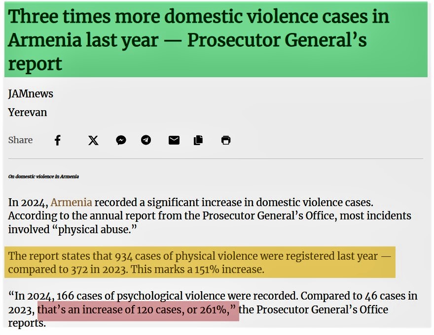 Ermənistanda məişət zorakılıqları da artmaqda davam edir. Baş Prokurorluğun illik hesabatına əsasən, 2024-cü ildə 1360 məişət zorakılığı faktı qeydə alınıb. Bunun 1100-ü (81 faiz) fiziki və psixoloji zorakılıq halları ilə bağlıdır. 2024-cü ildə fiziki zorakılıq halı da artaraq 934-ə çatıb ki, bu da 2023-cü illə müqayisədə (372) 151 faiz artım deməkdir. 2024-cü ildə 166 psixoloji zorakılıq halı qeydə alınıb. 2023-cü ildəki 46 hadisə ilə müqayisədə bu, 120 hadisə və ya 261 faiz çoxdur. Məişət və ya ailə zorakılığı hesab edilən qətl və sağlamlığa qəsdən ağır zərər vurma hallarında da artım qeydə alınıb. 2024-cü ildə məişət zorakılığı səbəbindən 13 qətl hadisəsi baş verib ki, bu da bir əvvəlki ilə nisbətən xeyli artımdır.jam-news