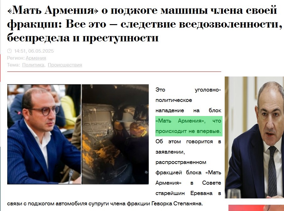 Bu ölkədə ictimai-siyasi təqiblər son illərdə azalmaq əvəzinə artmaqda davam edir. Bu günlərdə “Ana Ermənistan” fraksiyasının üzvünün ailəsinə qarşı növbəti hücum da kriminal qruplar tərəfindən siyasi təqiblərin ənənə halı aldığını göstərir. Belə ki, fraksiyanın üzvü Gevork Stepanyanın həyat yoldaşının avtomobilinin yandırılmasının arxasında siyasi motivlərin dayanması Stepanyanın yaydığı bəyanatda da əks olunub. news.am