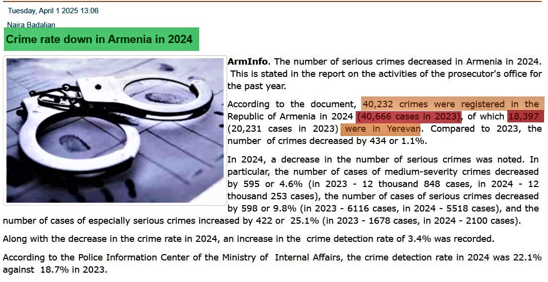 2024-cü ildə Ermənistanda 40 min 232 cinayət hadisəsi baş verib ki, xüsusi ağır cinayətlər üzrə hallar əvvəlki illə müqayisədə 422 say və ya 25,1 faiz artıb. arminfo