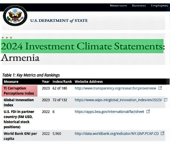 ABŞ Dövlət Departamentinin 2024-cü ilə dair investisiya mühiti hesabatına əsasən, Ermənistanda investisiya mühiti ilə bağlı çoxsaylı problemlər qalmaqdadır. Xarici şirkətlər məhkəmə sistemindəki qeyri-şəffaf şərait ucbatından biznes iddiaları ilə bağlı çətinliklərlə üzləşir. Biznes assosiasiyaları məhkəmə, vergi, gömrük, səhiyyə, təhsil və hüquq-mühafizə orqanlarında geniş islahatların aparılmalı olduğunu bildirir. İnvestorlar şəffaf, ədalətli və proqnozlaşdırıla bilən biznes mühitini təmin etmək üçün çoxsaylı problemlərin qaldığını və həll edilməli olduğunu vurğulayırlar. Onlar, həmçinin hökumət məmurları ilə qarşılaşdıqları problemləri operativ şəkildə həll edə bilmələrindən gileylənirlər. state.gov/reports