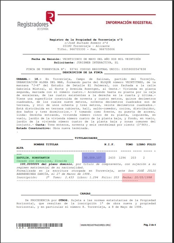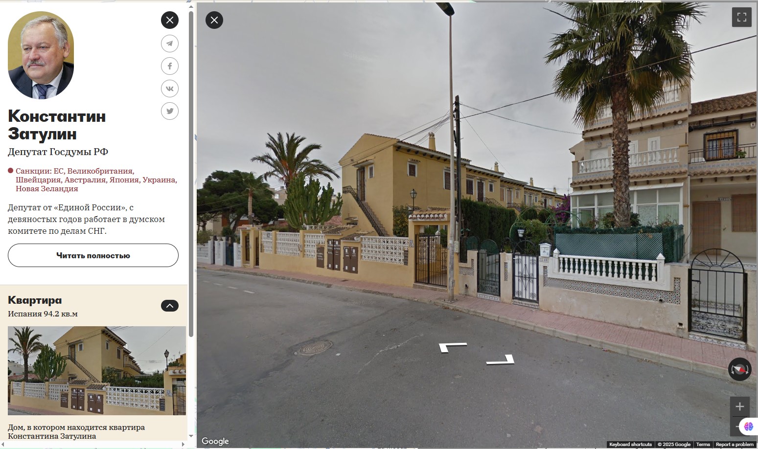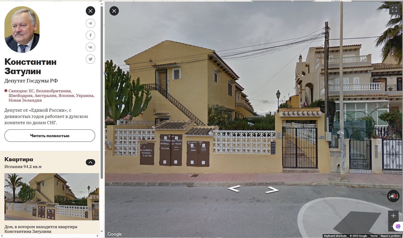 İspaniyadakı evə gəldikdə, araşdırmaçılar Zatulinin “Gabriela Mistral 23 Torrevieja, Alicante” ünvanında yerləşən 94,2 kv.metrlik villasının görüntülərini əldə edə biliblər.