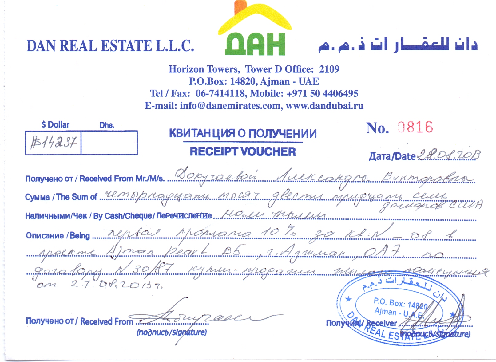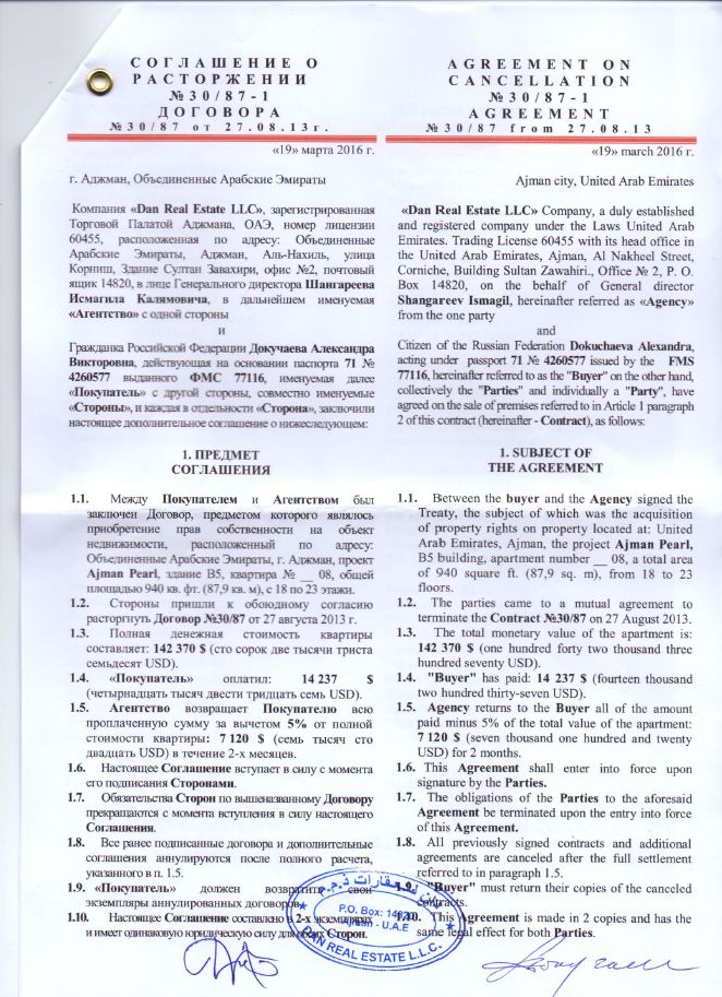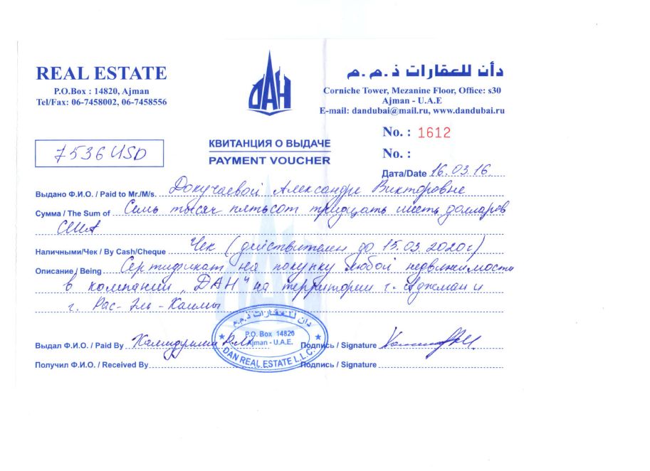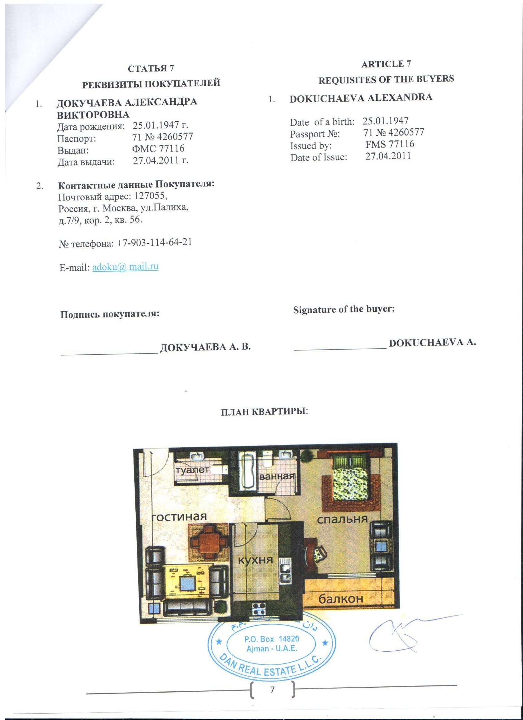 Bundan başqa həmin layihədə (“Ajman Pearl”, bina 5, mənzil 07A) dəyəri 79 329 dollar olan 34 kv.metrlik ikinci mənzilin alındığı da bəlli olub. Ehtimal edilir ki, evlərin hər ikisi Zatulin tərəfindən alınıb və o, özünə yaxın bildiyi Dokuçayevanın adına sənədləşdirib.