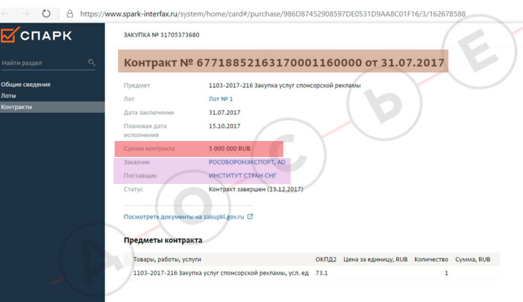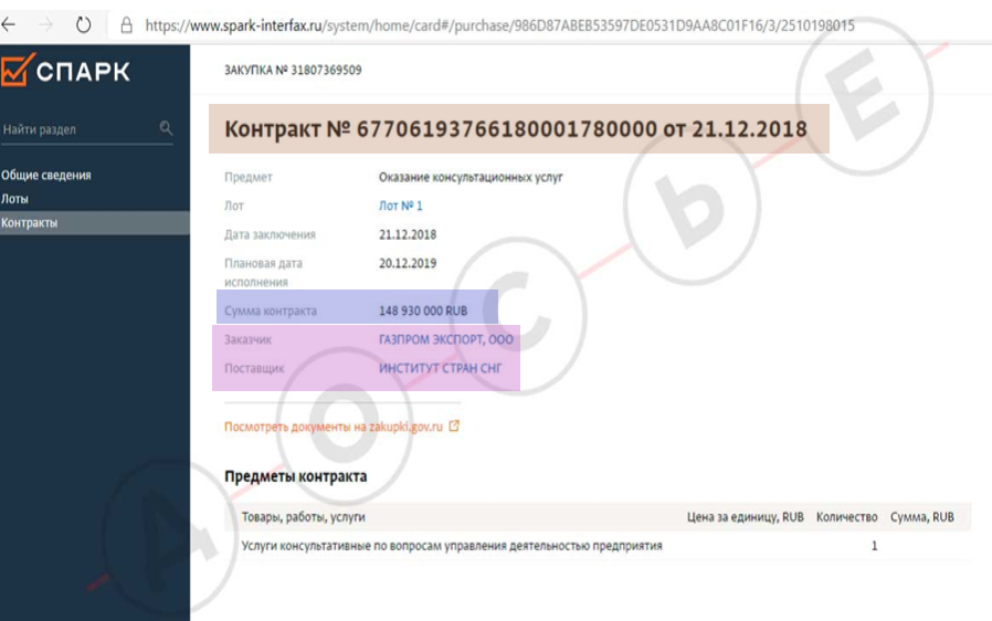 Qeyd edilən qrup əvvəlcə “MDB Ölkələri İnstitutu”nun maliyyələşdirilməsi məsələlərini yoxlayıb. Məlum olub ki, bu qeyri-hökumət təşkilatı, Rusiyanın dövlət şirkəti "Qazprom"un hesabına yaşayır. Onlar “Qazprom Ekspress” və İnstitut arasında bağlanan 10 dekabr 2015-ci il tarixli, "№ ГПЭ-10/12-2015” nömrəli xidməti müqaviləni sertifikatını aşkar ediblər.