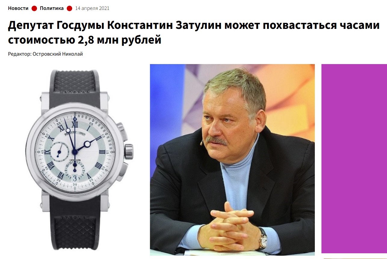 Rusiya mediasında 14 aprel 2021-ci ildə dərc olunan “Dövlət Dumasının deputatı Zatulin 2,8 milyon rublluq saatı ilə qürrələnir” başlıqlı yazı da bu barədədir.