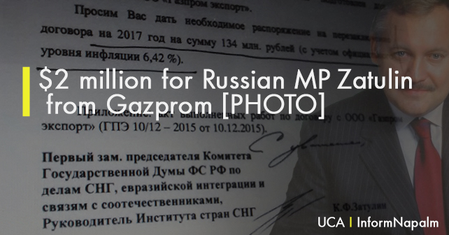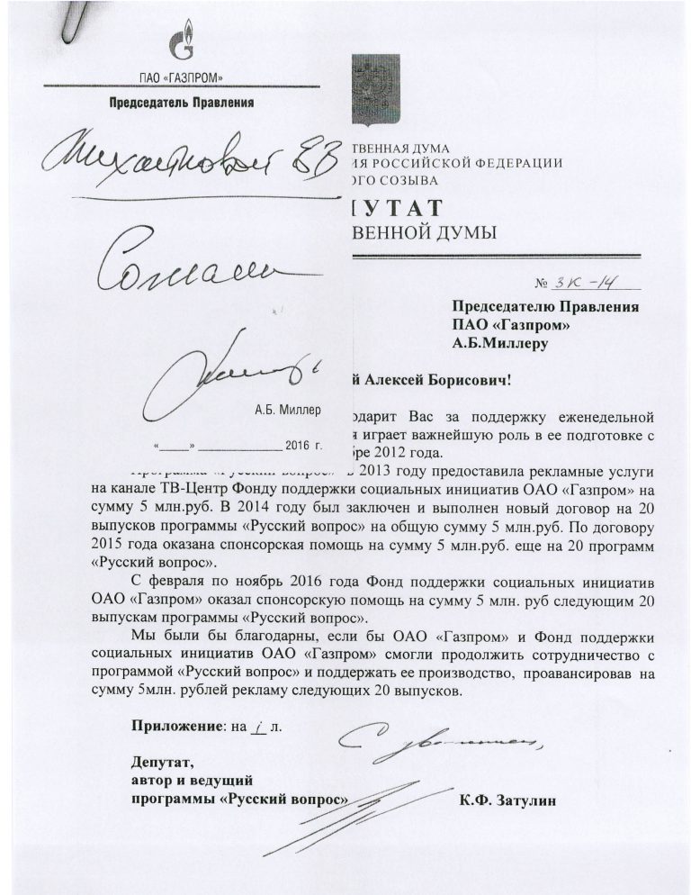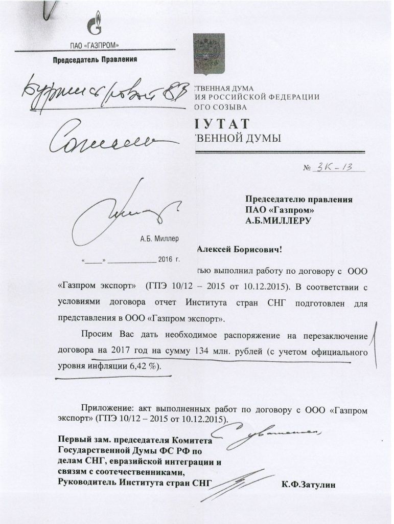 Zatulinin “Qazprom”un prezidenti Millerə ünvanladığı məktubda 2017-ci il üçün maliyyələşmənin miqdarını 134 mln. rubl etməyi xahiş edib.
