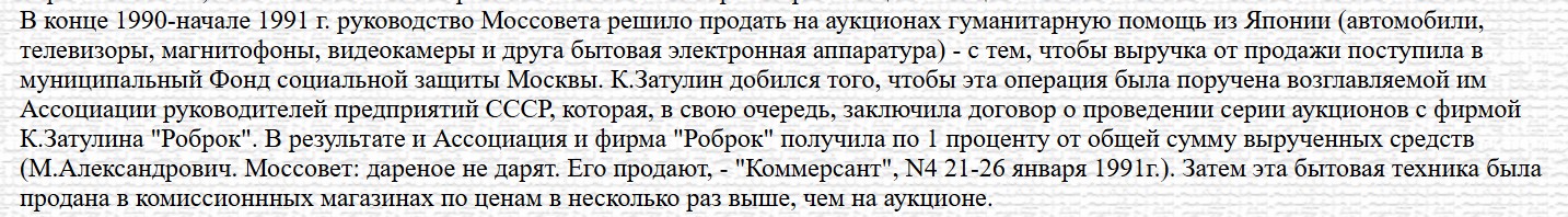 1990-cı ilin sonu - 1991-ci ilin əvvəllərində Moskva Şəhər Şurasının rəhbərliyi Yaponiyadan gələn humanitar yardımı (avtomobillər, televizorlar, maqnitofonlar, videokameralar və digər məişət elektron avadanlıqları) hərraca çıxarmaq qərarına gəldi ki, satışdan əldə olunan vəsait Moskva Meriyasının Sosial Müdafiə Fonduna daxil olsun. K.Zatulin bu əməliyyatı özünün rəhbərlik etdiyi SSRİ Müəssisə Rəhbərləri Assosiasiyasına (Ассоциации руководителей предприятий СССР) həvalə edilməsinə nail olur və həmin təşkilat öz növbəsində K.Zatulinin “Robrok” firması ilə bir sıra hərracların keçirilməsinə dair müqavilə bağlayır. Nəticədə həm Assosiasiya, həm də Robrok ümumi gəlirin bir faizini əldə edir. (M. Aleksandroviç. “Moskva Şəhər Şurası: Hədiyyə edilən verilmir, satılır” "Kommersant", N4, 21-26 yanvar 1991-ci il). Sonra bu məişət texnikası “komisyon mağazalarda” (Sovet dövründə xaricdən gələn malların satıldığı xüsusi imtiyazlı mağazalar belə adlanırdı-red.) auksiondakı qiymətdən bir neçə dəfə baha qiymətə satılıb.