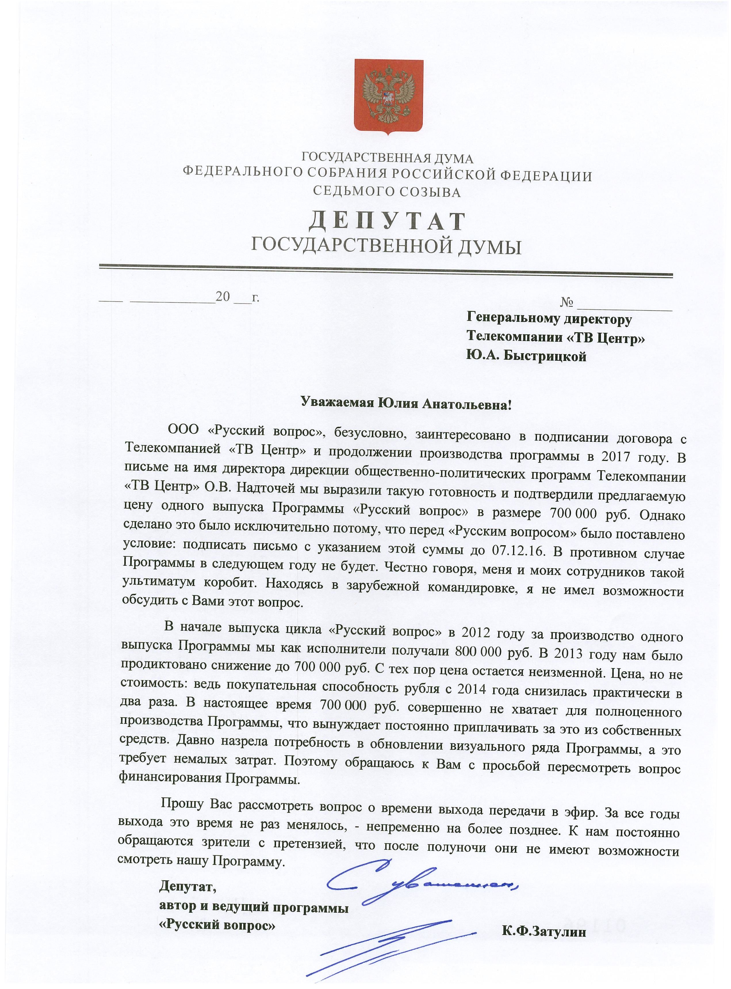 Nəhayət, 2017-ci ilin əvvəlində “ТВЦ” bu proqramın yayımını dayandırır. Amma onlar Zatulinin əndazəsiz israrını və donos yazmaq, şantaj etməkdə böyük bacarıq sahibi olduğunu düşünbəyiblər. Belə ki, Zatulin kanalın bu “özbaşınalığına” son qoymaq üçün Putinin özünə şikayət məktubu yazıb.