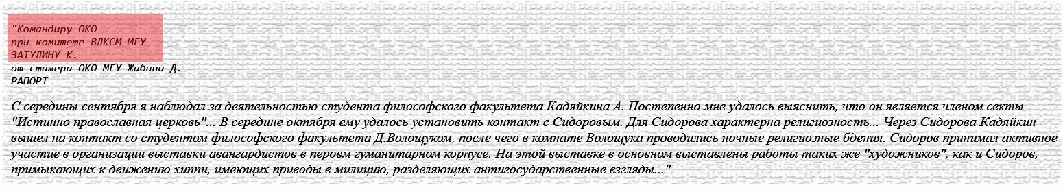 Hətta 1990-cı ilin yanvarında "Moskovskiy Komsomolets" qəzeti Moskva Dövlət Universitetinin tarix fakültəsi tələbələrinin siyasi etibarsızlığı barədə K. Zatulinə OKO əməkdaşlarının raportlarına istinadən məqalə dərc edib (Vadim Poeqli, "1984" və digərləri və ya könüllü istibdad haqda polemik qeydlər” (Вадим Поэгли. "1984" и другие, или полемические заметки о добровольном сыске " -"Московский Комсомолец", 23 января 1990 г.).