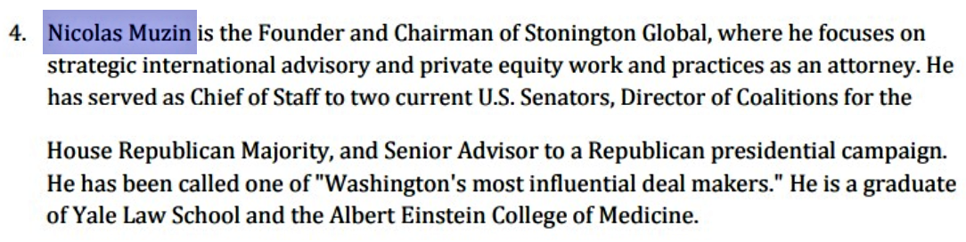 Nikolas David Muzin Kanada əsilli amerikalı, Respublikaçı siyasi-strateq, lobbist, hüquqşünas və həkimdir. O, ABŞ Nümayəndələr Palatasının Respublikaçılar Konfransı Koalisiyalarının direktoru vəzifəsində çalışıb və ABŞ prezidentliyinə Respublikaçılardan namizəd olan senator Ted Kruzun (Qeyd: ermənipərəst və anti-Türkiyə mövqe ilə məşhur olan senator baş məsləhətçisi və aparat rəhbərinin müavini olub. Bundan əvvəl N.Muzin, o vaxtkı konqresmen Tim Skottun aparat rəhbəri vəzifəsində çalışıb. 2016-cı il seçkilərindən sonra o, digər müştəriləri ilə yanaşı, Qətər Dövlətinin və Albaniya Demokratik Partiyasının maraqlarını təmsil edən “Stonington Strategies” adlı şirkət təsis edib.