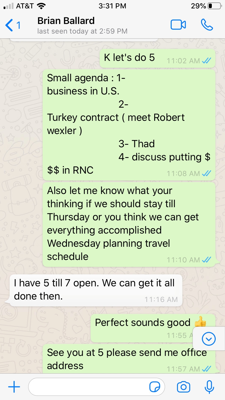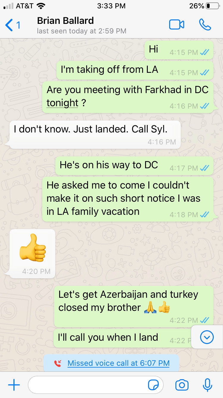 Bu mövzuda sonuncu detal Mənsimovun Parnasa göndərdiyi mesajın skrinidir. Yazışma 22 yanvar 2017-ci ildə baş tutub və Mənsimov Ballarddan Rza Zərrab işində səy göstərməsini istəyir. Mənsimovun Rza Zərrabın azad olunmasında maraqları və hər hansı əlaqələri haqda əlavə məlumat verilmir.