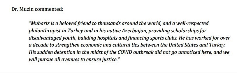 “Free Mubariz Mansimov” “Facebook” səhifəsi hətta müqavilə mətnini də qoşmaya əlavə etmişdir. Həmin qoşmada Muzinin Mənsimovun həbsinə reaksiyası belə təqdim edilib: “Mübariz dünyada minlərlə insanın sevimli dostu, Türkiyədə və vətəni Azərbaycanda çox hörmətli xeyriyyəçidir, imkansız gənclərə təqaüd verən, xəstəxanalar tikdirən və idman klublarını maliyyələşdirən şəxsdir. O, ABŞ və Türkiyə arasında iqtisadi və mədəni əlaqələri gücləndirmək üçün on ildən artıqdır ki çalışır. Onun COVID-19 pandemiyası dövrünə qəfil həbsi gözdən qaçmayıb və biz ədaləti təmin etmək üçün bütün yollara əl atacağıq”.