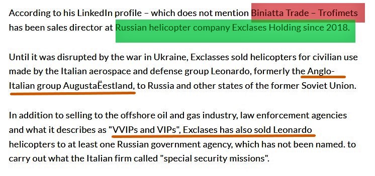 Hərçənd, Trofimetsin “LinkedIn” profilində “Biniatta Trade”-dən bəhs edilmir. Yalnız onun 2018-ci ildən Rusiyanın “Exclases Holding” helikopter şirkətində satış direktoru olduğu yazılıb.
