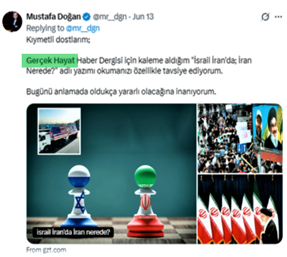 Mustafa Doğan uzun illərdir Türkiyənin mühafizəkar dərgilərindən sayılan "Gerçek hayat"ın yazarıdır. Bu nəşr 2000-ci ildə jurnalist Hakan Albayrağın baş redaktorluğu ilə çıxmağa başlayıb, 2016-cı ildən isə "Albayrak Media qrupu"nun tərkibinə daxildir.