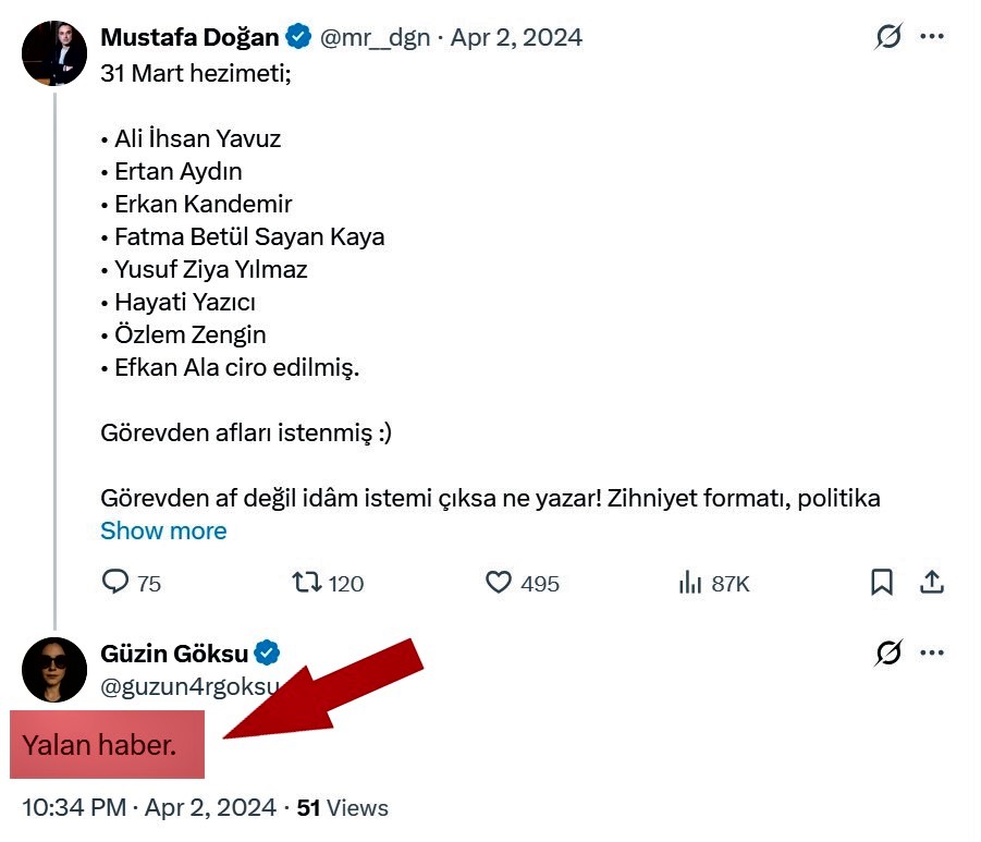 4-cü misal. M.Doğan 31 martda Türkiyədə yerli özünüidarəetmə orqanlarına keçirilən seçkilərdən sonra bir siyahı paylaşaraq bu şəxslərin vəzifə ilə vidalaşacaqlarını yazmışdı. Onun bu xəbəri də yalan çıxmışdı, çünki siyahıdakı bütün şəxslər hazırda öz vəzifələrini davam etdirirlər. “X” istifadəçiləri də onun yazdıqlarını yalan adlandırmışdılar.