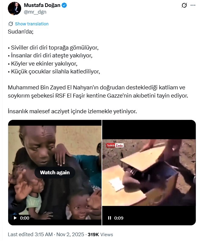 6-cı misal. Bir neçə gün öncə M.Doğan Sudanda baş verən hadisələr haqqında status paylaşıb. Həmin statusda paylaşılan videoda qaradərili bir gənc kişini diri-diri tabuta qoyulduğu görüntülənib. Araşdırma zamanı məlum olub ki, bu videonun Sudana və müsəlmanlara qarşı dini ayrı-seçkiliyə heç bir aidiyyəti yoxdur. Hadisə 2016-cı ilin noyabrında Cənubi Afrika Respublikasında baş verib və həmin hadisələrə görə CAR-ın iki ağdərili sakini məhkəmə qarşısına çıxarılıb.