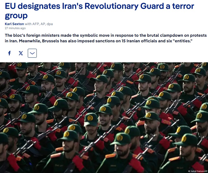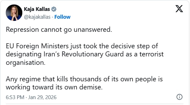 Aİ Xarici İşlər naziri Kaja Kallas bildirib ki, Aİ xarici işlər nazirləri cümə axşamı günü İranın İslam İnqilabı Keşikçiləri Korpusunu "terrorçu" qrup kimi tanımaq barədə razılığa gəliblər. K.Kallas əlavə edib ki, "Minlərlə öz vətəndaşını öldürən istənilən rejim öz süqutuna doğru gedir".