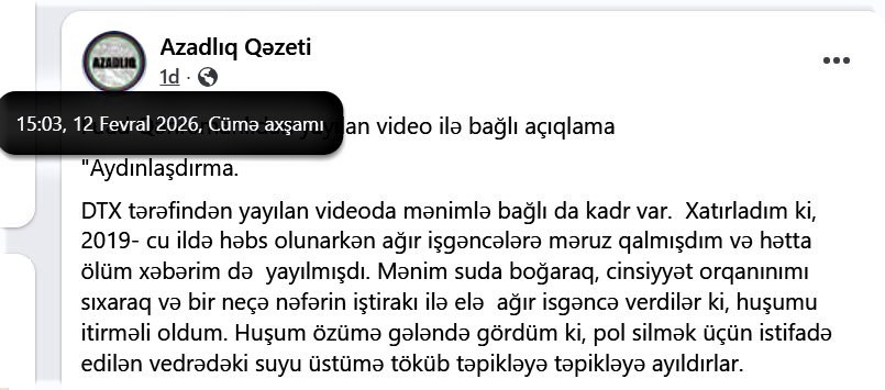 3-cü məqam. Qəhrəmanlı açıqlamasını paylaşandan 13 dəqiqə sonra “Azadlıq Qəzeti” “Facebook” səhifəsi həmin statusu olduğu kimi paylaşır.
