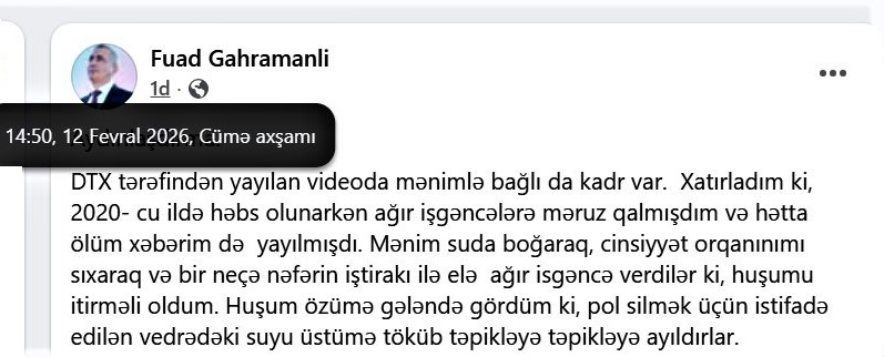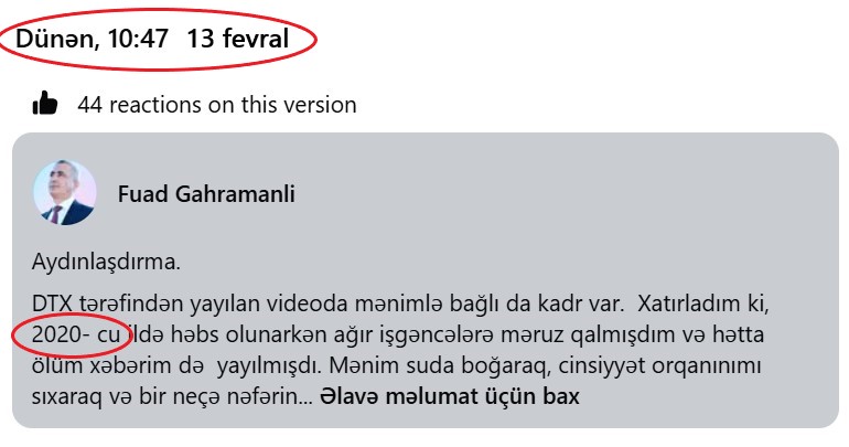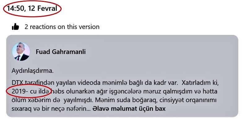 2-ci məqam. O “öz lideri” haqqında etiraflarını təkzib etmədən, tələm-tələsik status yazmaq qərarına gəlir və burada işgəncələr və digər məsələlərlə bağlı cəfəng fikirlər səsləndirməyə başlayır. Nəyə görə cəfəng, çünki bu hadisələrin o, 2019-cu ildə baş verdiyini qeyd edir. Halbuki onun tibbi maskada ifadə verməsi 2020-ci ildən başlayan COVID-19 pandemiyası ilə, Milli Məclisin qarşısındakı mitinqdə təşkilatçı-təhrikçi kimi istintaqa cəlb edilməsi də 2020-ci il Vətən müharibəsindən bir neçə ay öncəki dövrə aid idi.