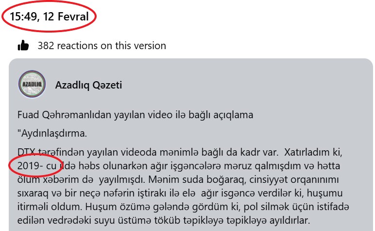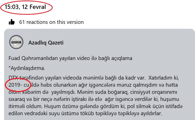. Daha maraqlısı isə bundan sonra baş verir. Belə ki, “Azadlıq Qəzeti” “Facebook” səhifəsini idarə edənlər 46 dəqiqə sonra “F.Qəhrəmanlının açıqlaması” adlı statusa “Həsən Kərimovla bağlı” hissəni uyduraraq əlavə edirlər. Halbuki Qəhrəmanlının öz səhifəsində bununla bağlı bir şey deyilmir. Yalnız bir gün sonra (fevralın 13-ü saat 10:47-də) F.Qəhrəmanlı öz səhifəsinə “Həsən Kərimovla bağlı” uydurmanı əlavə edir.