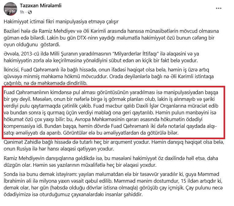 - F.Qəhrəmanlının “öz liderinə” xəyanət etdiyi kadrlarla ifşa olunduğu anladığı üçün tələm-tələsik, səhvlərlə dolu status yazması, açıqlamalarında səsləndirdiyi fikirlərin bir-biri ilə uzlaşmaması, yalan məlumat verməsi bunu bir daha təsdiqləyir;