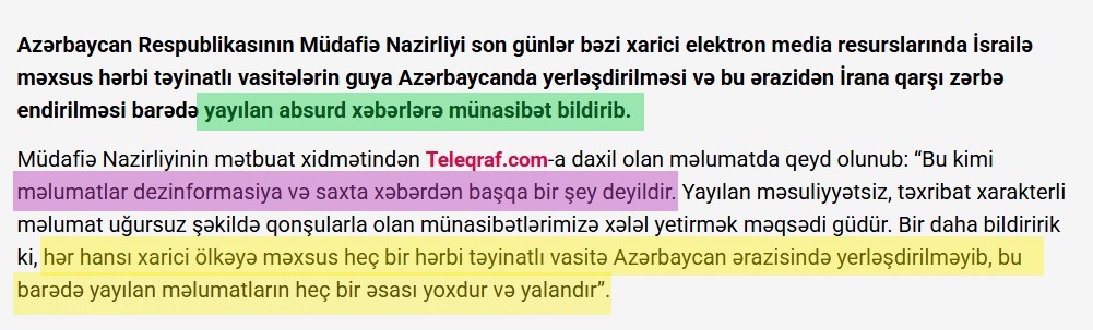 İkincisi, İsrailin Azərbaycan Respublikasında hər hansı qüvvələrinin olmadığı rəsmi şəkildə dəfələrlə bəyan edilib. Azərbaycan Respublikasının Müdafiə Nazirliyi yaydığı bəyanatda İsrailə məxsus hərbi təyinatlı vasitələrin guya Azərbaycanda yerləşdirilməsi və bu ərazidən İrana qarşı zərbə endirilməsi barədə yayılan absurd xəbərlərə münasibət bildirərək bu kimi məlumatlar dezinformasiya və saxta xəbər olduğunu diqqətə çatdırıb. Sitat: “Hər hansı xarici ölkəyə məxsus heç bir hərbi təyinatlı vasitə Azərbaycan ərazisində yerləşdirilməyib, bu barədə yayılan məlumatların heç bir əsası yoxdur və yalandır”.