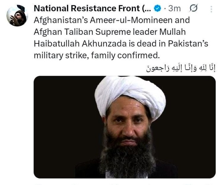 Əfqanıstanda hakim "Taliban" hərəkatının ali lideri Heybətullah Axundzadənin Pakistanın hava hücumunda həlak olması ilə bağlı xəbərlər yayılır. Əfqanıstanda Taliban və digər islamçı hərəkatlara qarşı çıxan Milli Müqavimət Cəbhəsi sosial mediada bildirib ki, Əfqanıstanda hakimiyyətdə olan Taliban hərəkatının ali lideri Heybətullah Axundzadə Pakistanın hava hücumunda öldürülüb.