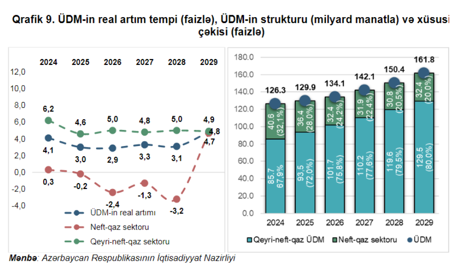 Məsələn, Beynəlxalq Valyuta Fondunun (BVF) proqnozlarına görə, 2030-cu ilin sonuna Azərbaycanda ÜDM-nin nominal həcmi 171,522 milyard manat (100,895 milyard ABŞ dolları) təşkil edəcək. Bu, adambaşına 10,8 min dollar ÜDM deməkdir.