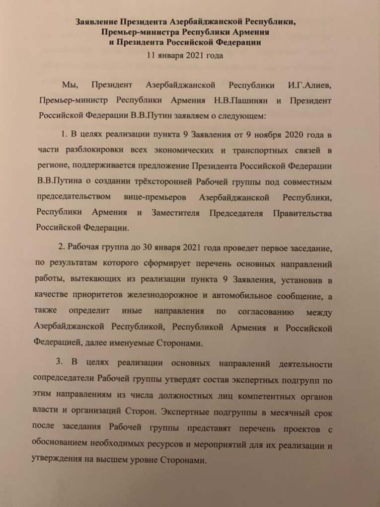 As for the ambassador's opinion that "the November 9 statement does not solve all issues," in fact, this is the position of Paris. France is simply trying to create such an image. In fact, the document envisages all the steps for the post-war period. Most importantly, an issue that could play the role of a guarantor of peace, such as the opening of transport corridors, was raised. Moreover, the Moscow Tripartite Declaration dated January 11, 2021 was signed, which envisages the realization of this point. The reference to the November statement in the January 11 statement means that this statement is based on the continuation of the settlement process, so this document will play a key role in the next steps.