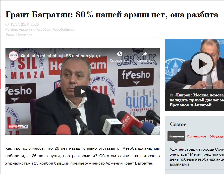 Former Armenian Prime Minister Hrant Bagratyan admitted in a press release that “80% of our army is missing, it has been destroyed. There is no army, this is not a defeat, this is a fiasco.” (Source)