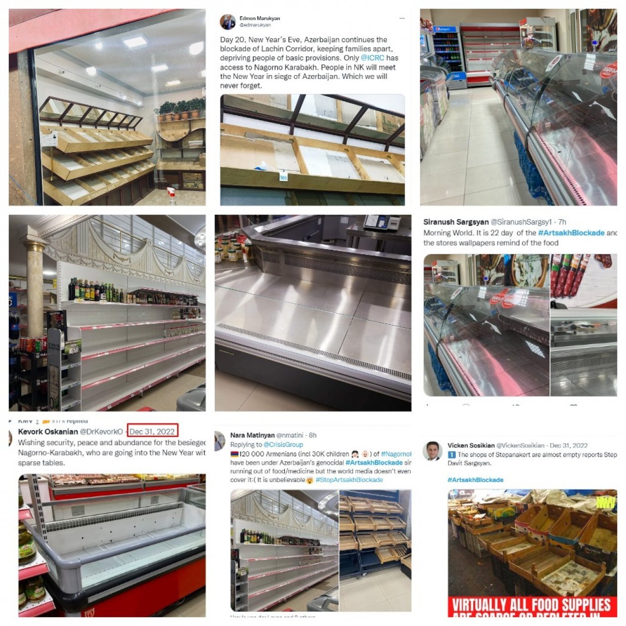 Azerbaijani Twitter user Konul Sahin first exposed the "blockade, hunger and misery" show of Armenians. The 13 tweets shared by Sahin on December 31 and January 1 clearly explained the situation in Khankandi. Tweet1 Tweet2 Tweet3 Tweet4 Tweet5 Tweet6 Tweet7 Tweet8 Tweet9 Tweet10 Tweet11 Tweet12 Tweet13
