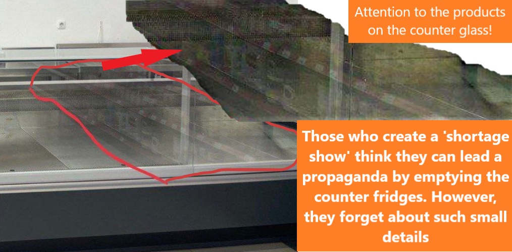Fact 6. An empty refrigerator is displayed in one of the stores. But those who carried out this propaganda forgot to put aside the frozen meat and fish they placed in front of the store refrigerator and left such a scene of exposure as a "gift" to us.