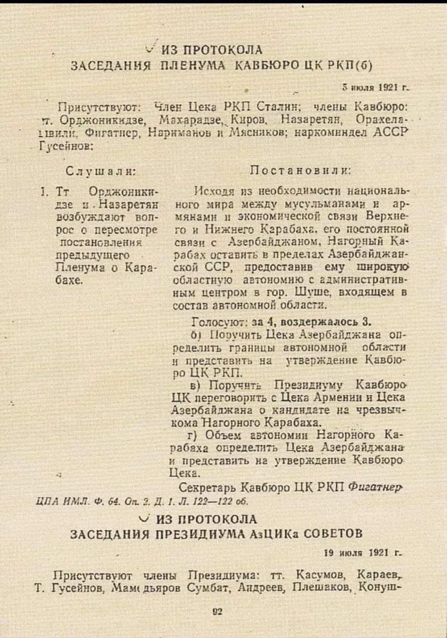 - Taking into account the importance of national peace between Muslims and Armenians and taking into account the fairly close economic ties between Upper and Lower Karabakh with Azerbaijan, leave Nagorno-Karabakh as part of the AzSSR with the introduction of a broad regional autonomy with the Administrative center of Shusha city, which remains part of the Autonomous Region. 4 voted in favor, 3 abstained.