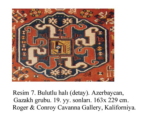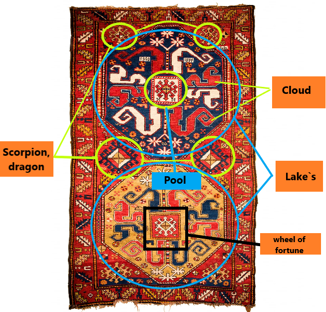 Apparently, this motif symbolizes flowing waters, the movement of clouds across the sky and “the good dragon sent by God to control the rain and waters” (L. Kerimov “Azerbaijan Carpet”, 2nd volume, 1983: 84). The square in the center of the medallions depicts a “wheel-star”. The combined use of these motifs is a manifestation of the idea of a pair of dragons turning the “wheel of fortune” in ancient Turkic mythology (Coruhlu, 2000, p. 133).