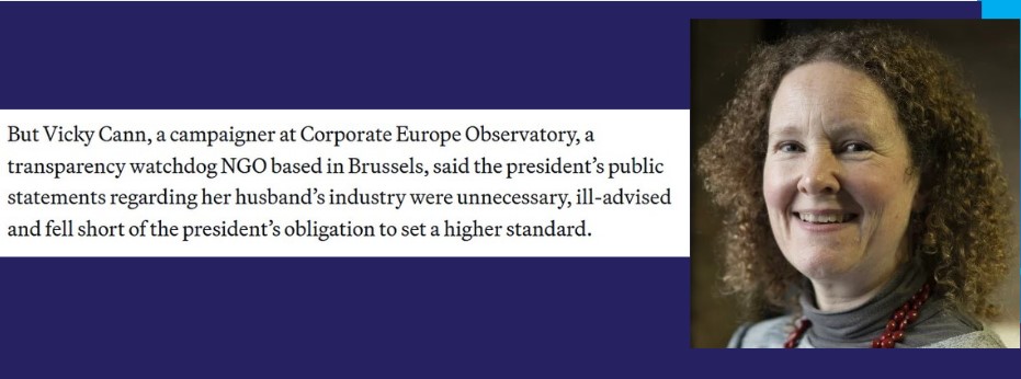 Vicky Cann with the Corporate Europe Observatory argued that president’s public statements regarding her husband’s industry fell short of the president's duty to set a higher standard.