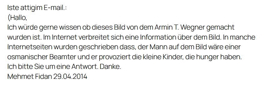 In your inquiry to the Armin T. Wegner Association, you asked whether the photo in question belongs to Armin T. Wegner. Mr. Klan from the Armin T. Wegner Association has forwarded your question to me.