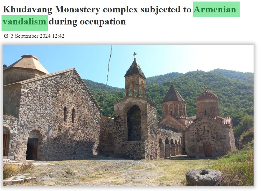 The falsifications by the Armenians - their lies about the alleged destruction of historical monuments by Azerbaijan in the territories they once occupied - have been exposed one by one with concrete facts. When retreating from the Azerbaijani villages they had occupied, including the Khudavang Monastery in Kalbajar, the Armenians themselves destroyed these historical monuments and then sought to place the blame for this vandalism on Azerbaijan. (link)