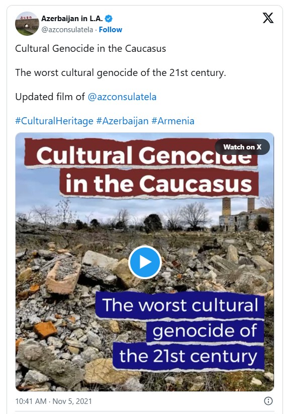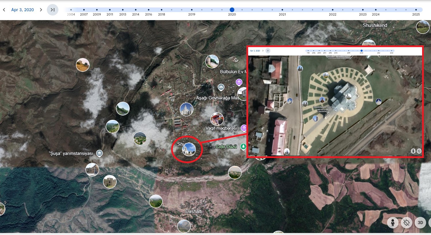 Claim 2: Christian religious monuments in Karabakh are being subjected to mass destruction. Quote: “In 2023 alone, reports documented alarming levels of violence against Christians and other religious minorities. For example, satellite imagery revealed the destruction of Armenian Christian sites in Nagorno-Karabakh following Azerbaijan's military takeover of the region. Churches, cemeteries, and schools were deliberately damaged or destroyed, underscoring the regime's systematic targeting of religious heritage.”