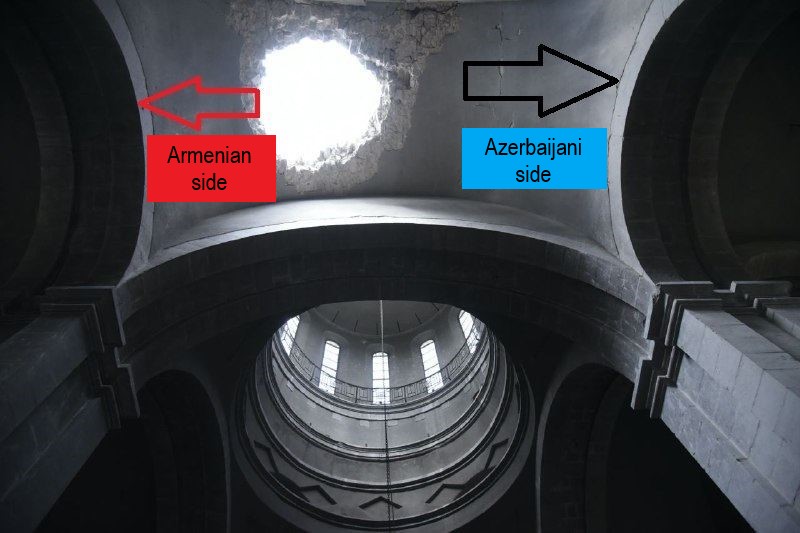 These photos, meanwhile, were taken and disseminated by Armenians after the church was shelled. The phrase ‘Azerbaijani side’ written on the photos serves solely to indicate direction. It should be noted that at that time, the closest distance to the church from the Azerbaijani side was no less than 70-80 km.
