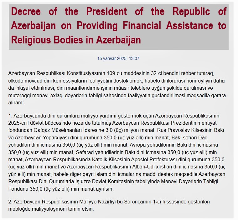 The Azerbaijani government consistently undertakes major renovations of these churches and religious monuments, allocates funds from the national budget to religious communities, and provides essential support to meet their needs.