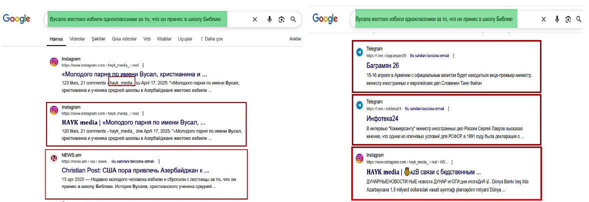 Our comment: The claims that a student named Vüsal brought a Bible to school and was beaten by fellow students are entirely fabricated, baseless, and false. No such incident has ever occurred in Azerbaijan’s educational institutions, including religious schools. Furthermore, no such information can be found on social media or any other digital platforms. The following are the results from a Google search in Azerbaijani, when searching for, “Student named Vusal who brought Bible to school.”