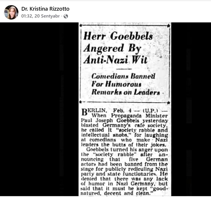 For example, on Sept. 19, a Reddit user posted an image only featuring the newspaper article's first few paragraphs. The user shared the sarcastic text caption, "Glad I didn't live back then." The story's headline and subheading read, "Herr Goebbels Angered By Anti-Nazi Wit. Comedians Banned For Humorous Remarks on Leaders." The beginning of the article displayed authorship attribution to the United Press, later called United Press International.