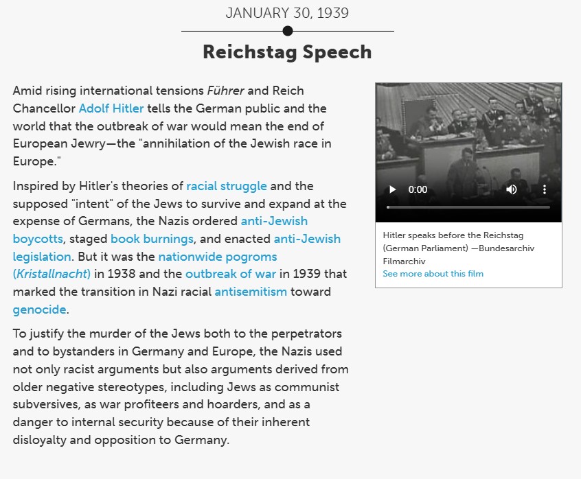 We did not yet locate online Goebbels' "three and one-half column editorial" from the former Nazi Party newspaper Völkischer Beobachter. The Feb. 3 entry in Goebbels' diary (only visible when borrowed) identified the editorial as published on Jan. 30 — the same day as Hitler's Reichstag speech, in which he told the German public and the world that the outbreak of war would mean "the annihilation of the Jewish race in Europe." Goebbels wrote in his diary, in part, "My piece on the 30th January appears in a prominent position in the Völkischer Beobachter. I think it works well."