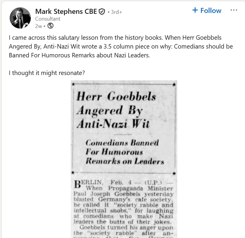 A rumor that circulated online in September 2025 claimed an image showed a real newspaper article from Feb. 4, 1939, reporting that high-ranking Nazi Party leader Joseph Goebbels — the minister of propaganda for the German Third Reich under Adolf Hitler — banned five comedians for joking about the party and its leaders.