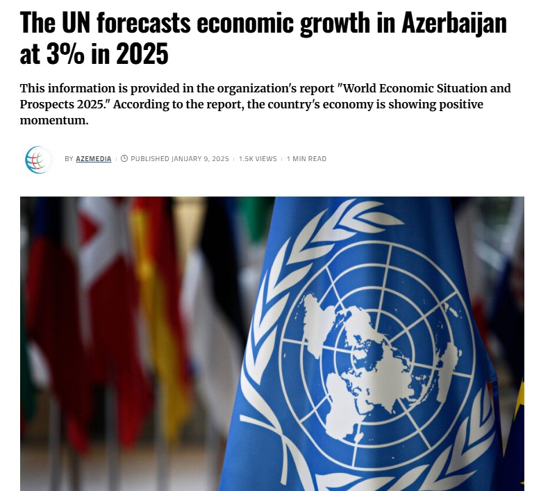 In its World Economic Situation and Prospects 2025 report, the United Nations classifies Azerbaijan among the countries demonstrating stable growth dynamics and sustainable development compared with most regional states. UN experts note that, alongside GDP growth, inflation in Azerbaijan is expected to remain stable while continuing to support positive social indicators. Source: World Trade Scanner