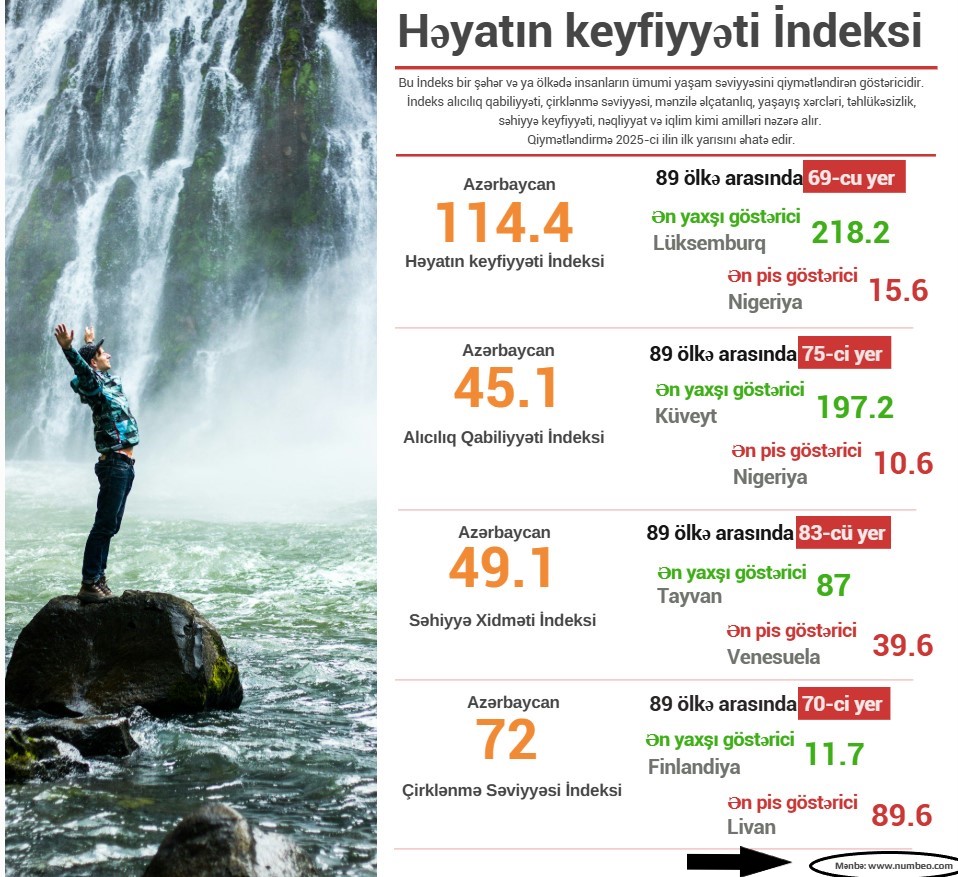 So, it becomes clear that the figures presented by A. Goyushov were taken from the “Quality of Life Index” published by the online research platform Numbeo. This so-called “research center,” which has consistently disseminated biased information about Azerbaijan (a matter we will address separately - ed.), ranked Azerbaijan 69th in the world in its latest report, with a score of 114.4 points.