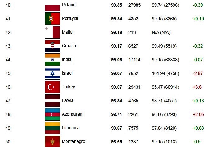 Even more strikingly, Palestine is ranked 61st, Hungary 63rd, Saudi Arabia 67th, Kuwait 71st, Bulgaria 75th, and Turkiye 79th.